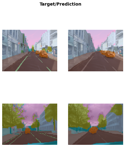 We can visualize how well it achieved its task, by asking the model to color-code each pixel of an image. As you can see, it nearly perfectly classifies every pixel in every object. For instance, notice that all of the cars are overlaid with the same color and all of the trees are overlaid with the same color (in each pair of images, the lefthand image is the ground truth label and the right is the prediction from the model):