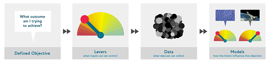 We use data not just to generate more data (in the form of predictions), but to produce actionable outcomes. That is the goal of the Drivetrain Approach. Start by defining a clear objective. For instance, Google, when creating their first search engine, considered “What is the user’s main objective in typing in a search query?” This led them to their objective, which was to “show the most relevant search result.” The next step is to consider what levers you can pull (i.e., what actions you can take) to better achieve that objective. In Google’s case, that was the ranking of the search results. The third step was to consider what new data they would need to produce such a ranking; they realized that the implicit information regarding which pages linked to which other pages could be used for this purpose. Only after these first three steps do we begin thinking about building the predictive models. Our objective and available levers, what data we already have and what additional data we will need to collect, determine the models we can build. The models will take both the levers and any uncontrollable variables as their inputs; the outputs from the models can be combined to predict the final state for our objective.