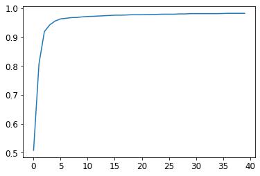 We’re not showing the 40 lines of output here to save room; the training process is recorded in learn.recorder, with the table of output stored in the values attribute, so we can plot the accuracy over training as:
