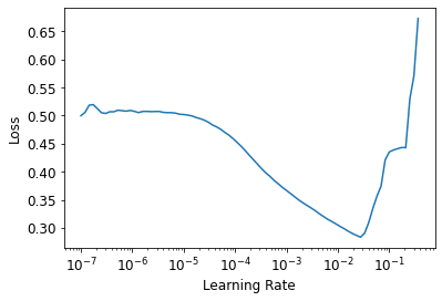 n_out=1, loss_func=F.mse_loss)learn.lr_find()SuggestedLRs(lr_min=0.002754228748381138, lr_steep=0.00015848931798245758)