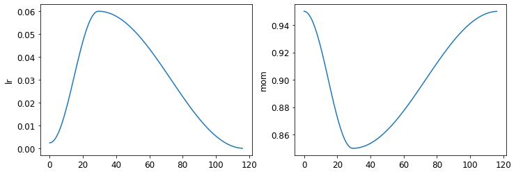 lr_max:: The highest learning rate that will be used (this can also be a list of learning rates for each layer group, or a Pythonsliceobject containing the first and last layer group learning rates)div:: How much to dividelr_maxby to get the starting learning ratediv_final:: How much to dividelr_maxby to get the ending learning ratepct_start:: What percentage of the batches to use for the warmupmoms:: A tuple(mom1,mom2,mom3)wheremom1is the initial momentum,mom2is the minimum momentum, andmom3is the final momentum