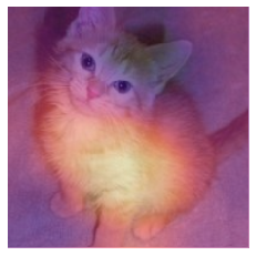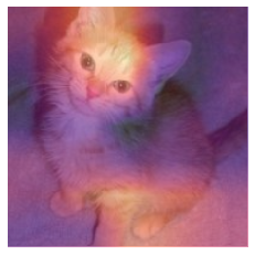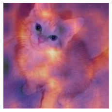 The areas in bright yellow correspond to high activations and the areas in purple to low activations. In this case, we can see the head and the front paw were the two main areas that made the model decide it was a picture of a cat.