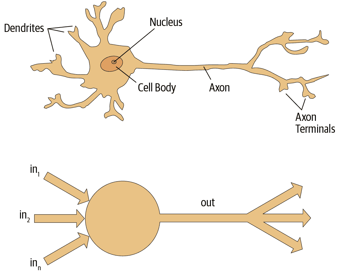 麦卡洛克和皮茨意识到,可以使用简单的加法和阈值处理来表示真实神经元的简化模型,如图 1-1 所示。皮茨是自学成才的,12 岁时就收到了与伟大的伯特兰·罗素一起在剑桥大学学习的邀请。他没有接受这个邀请,事实上,他一生中没有接受任何高级学位或权威职位的邀请。他大部分著名的工作都是在无家可归时完成的。尽管他没有正式认可的职位,社交孤立日益加剧,但他与麦卡洛克的合作对心理学家弗兰克·罗森布拉特产生了影响。