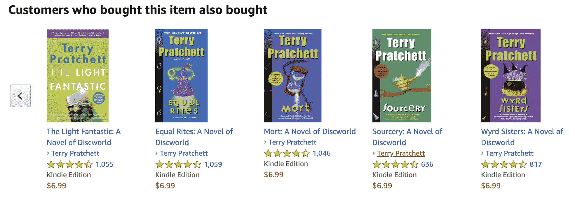然而,几乎所有的机器学习方法都有一个缺点,那就是它们只告诉你一个特定用户可能喜欢哪些产品,而不是对用户有用的推荐。用户可能喜欢的产品的许多种推荐可能根本不会有任何帮助——例如,如果用户已经熟悉这些产品,或者如果它们只是用户已经购买过的产品的不同包装(例如,当他们已经拥有该套装中的每一件物品时,推荐一个小说的套装)。Jeremy 喜欢读特里·普拉切特的书,有一段时间亚马逊一直在向他推荐特里·普拉切特的书(见图 2-1),这实际上并不是有用的,因为他已经知道这些书了!