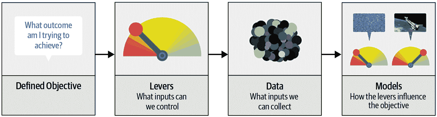 驱动系统方法,如图 2-2 所示,详细介绍在“设计出色的数据产品”中。基本思想是从考虑您的目标开始,然后考虑您可以采取哪些行动来实现该目标以及您拥有的(或可以获取的)可以帮助的数据,然后构建一个模型,您可以使用该模型确定为实现目标而采取的最佳行动。