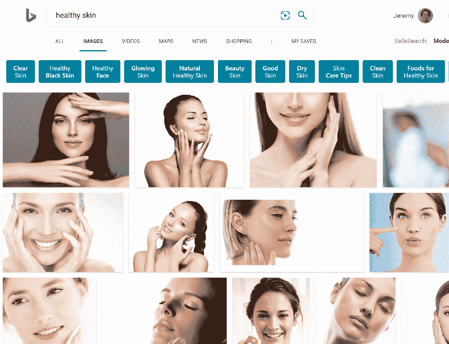 failed.map(Path.unlink);在这个过程中要注意的一件事是:正如我们在第一章中讨论的,模型只能反映用于训练它们的数据。而世界充满了有偏见的数据,这最终会反映在,例如,Bing 图像搜索(我们用来创建数据集的)。例如,假设您有兴趣创建一个应用程序,可以帮助用户确定他们是否拥有健康的皮肤,因此您训练了一个模型,该模型基于搜索结果(比如)“健康皮肤”。图 2-3 展示了您将获得的结果类型。