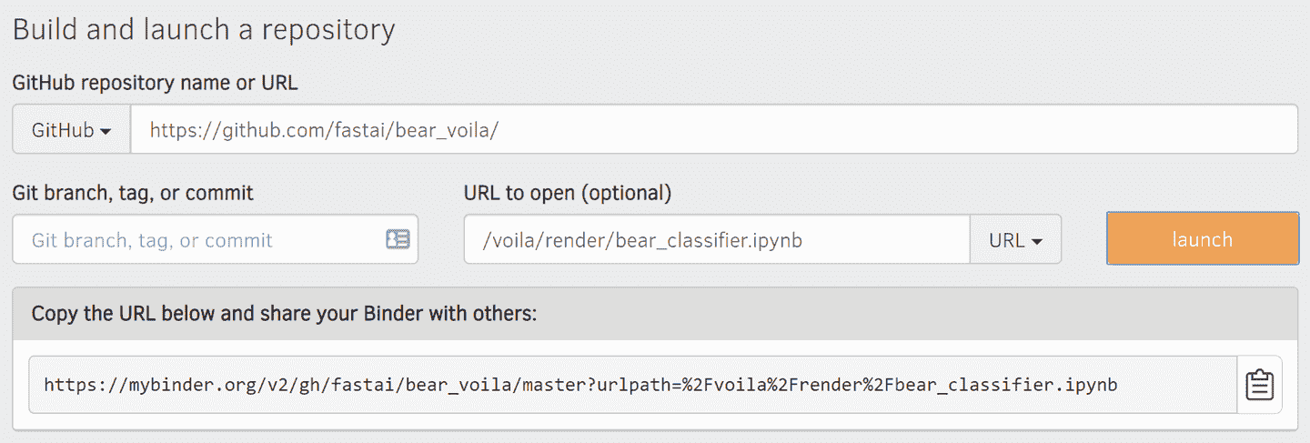 将该存储库的 URL 粘贴到 Binder 的 URL 字段中,如图 2-4 所示。