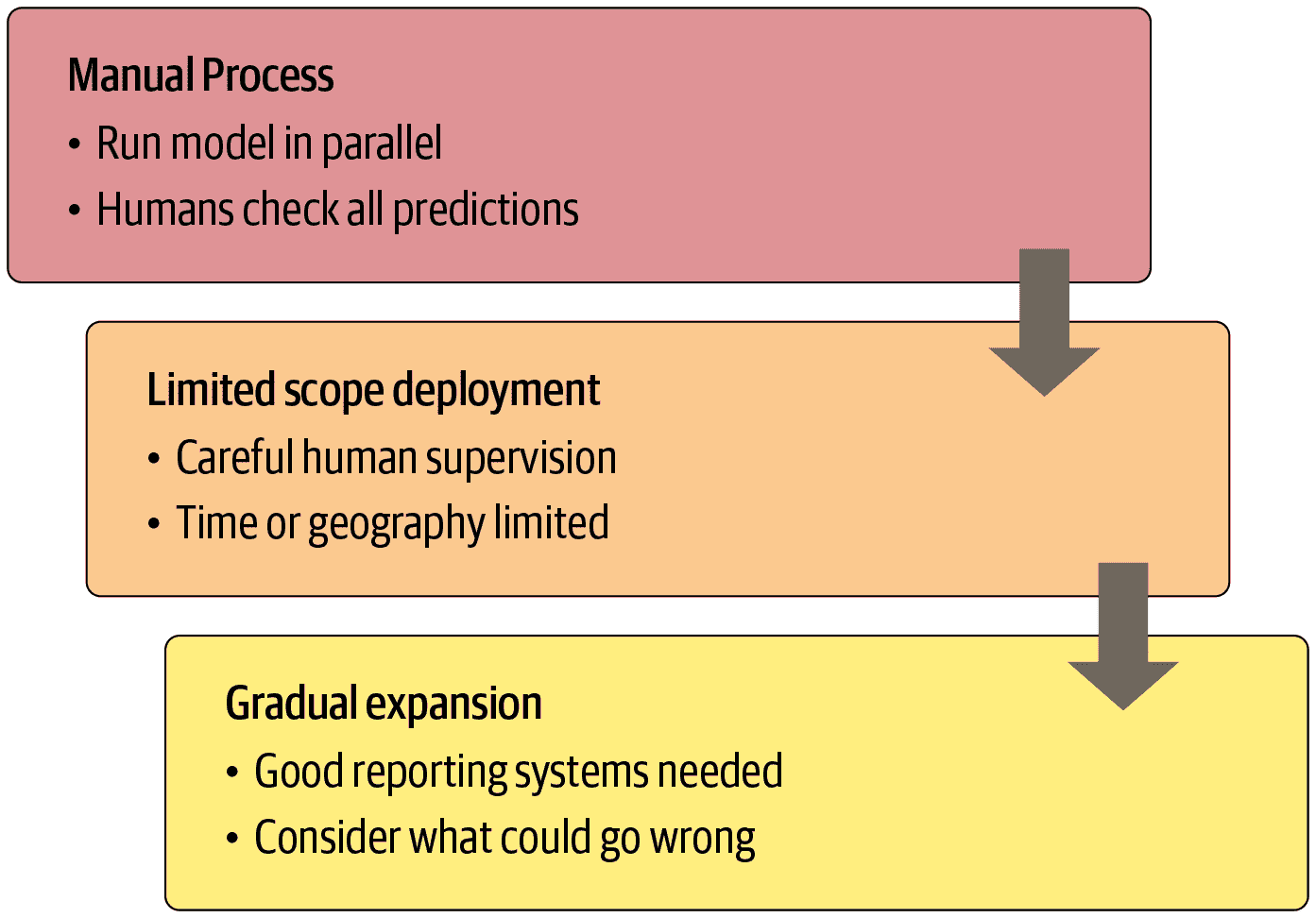 在可能的情况下,第一步是使用完全手动的过程,您的深度学习模型方法并行运行,但不直接用于驱动任何操作。参与手动过程的人员应查看深度学习输出,并检查其是否合理。例如,对于我们的熊分类器,公园管理员可以在屏幕上显示所有摄像头的视频源,任何可能的熊目击都会被简单地用红色突出显示。在部署模型之前,公园管理员仍然应该像以前一样警惕;模型只是在这一点上帮助检查问题。