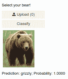 现在我们在这个 Jupyter 笔记本中已经让一切运转起来了,我们可以创建我们的应用程序。为此,请启动一个新的笔记本,并仅添加创建和显示所需小部件的代码,以及任何要显示的文本的 Markdown。查看书中存储库中的bear_classifier笔记本,看看我们创建的简单笔记本应用程序。