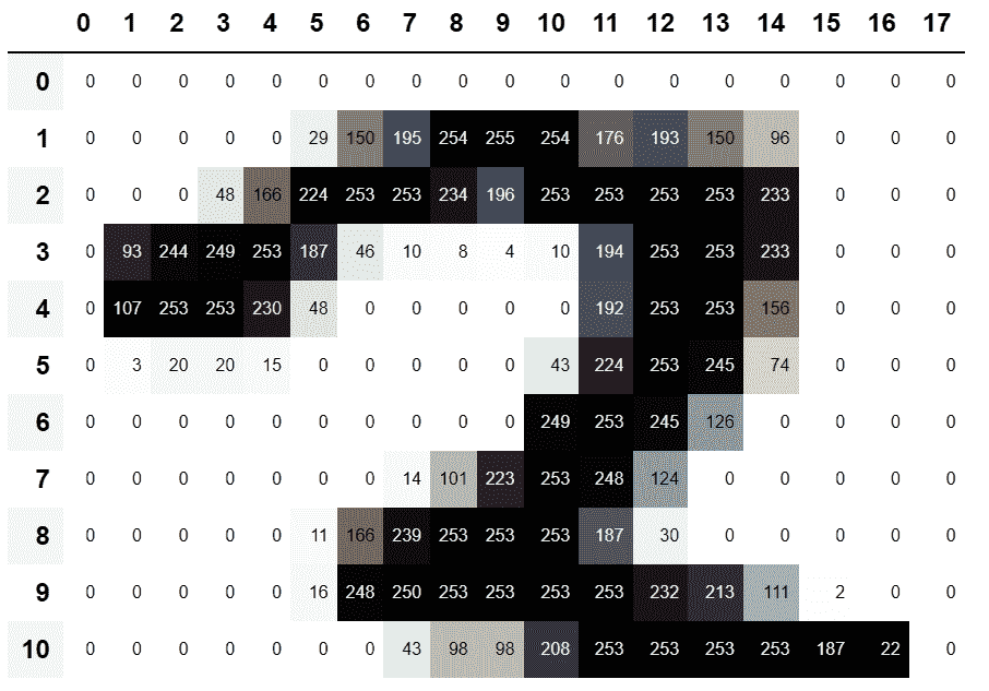 [ 0, 3, 20, 20, 15, 0]], dtype=torch.uint8)我们可以切片数组,只选择包含数字顶部部分的部分,然后使用 Pandas DataFrame 使用渐变对值进行着色,这清楚地显示了图像是如何由像素值创建的:
