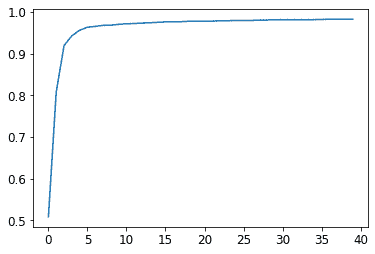 loss_func=mnist_loss, metrics=batch_accuracy)learn.fit(40, 0.1)我们这里不展示 40 行输出,以节省空间;训练过程记录在learn.recorder中,输出表存储在values属性中,因此我们可以绘制训练过程中的准确性: