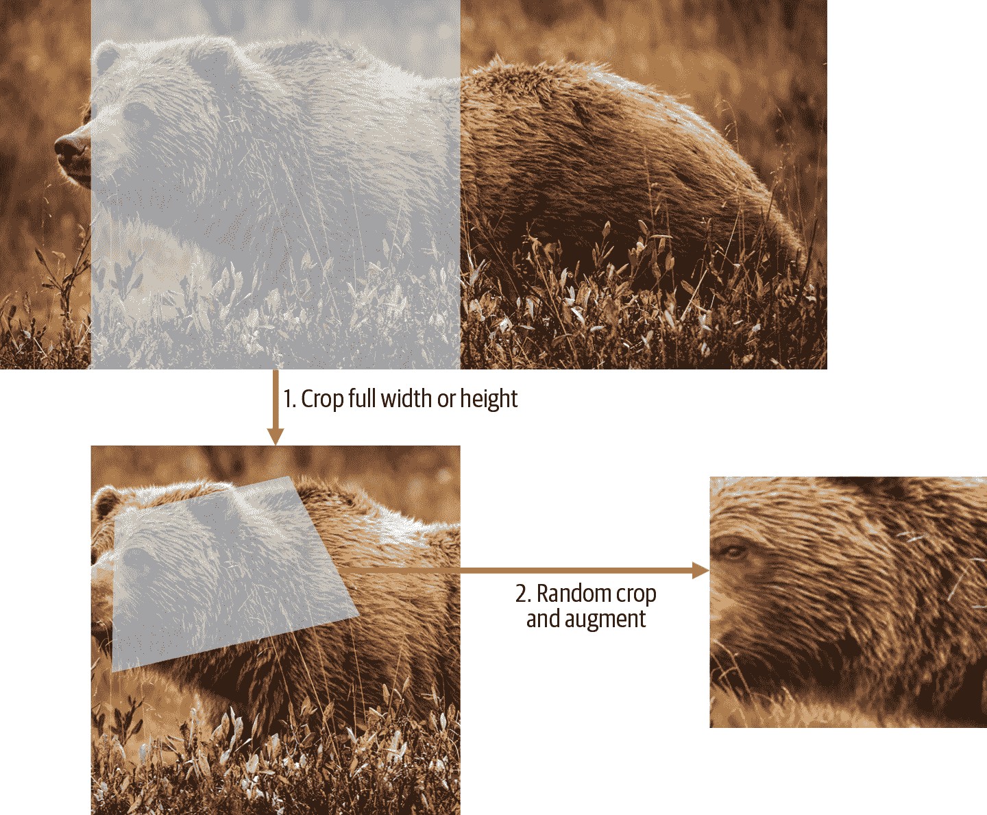 item_tfms中,因此它应用于每个单独的图像,然后再复制到 GPU。它用于确保所有图像具有相同的尺寸。在训练集上,裁剪区域是随机选择的。在验证集上,总是选择图像的中心正方形。随机裁剪和增强:这在