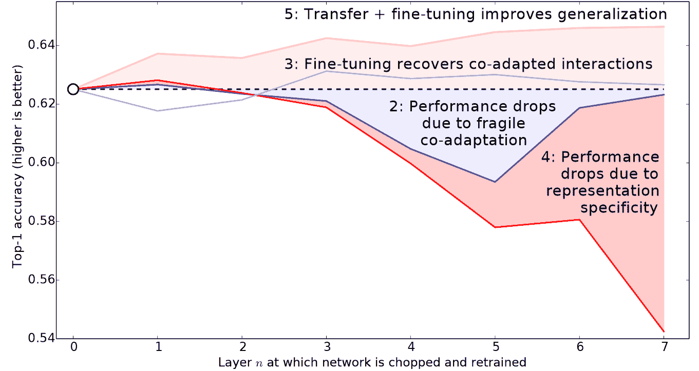 图 5-4。不同层和训练方法对迁移学习的影响(由 Jason Yosinski 等人提供)