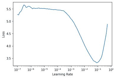 请注意,图表与随机权重时有所不同:我们没有那种表明模型正在训练的陡峭下降。这是因为我们的模型已经训练过了。在这里,我们有一个相对平坦的区域,然后是一个急剧增加的区域,我们应该选择在那个急剧增加之前的一个点,例如 1e-5。具有最大梯度的点不是我们在这里寻找的,应该被忽略。
