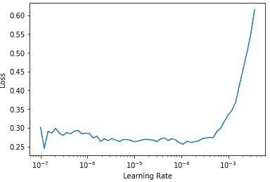 learn.lr_find()(1.0964782268274575e-05, 1.5848931980144698e-06)