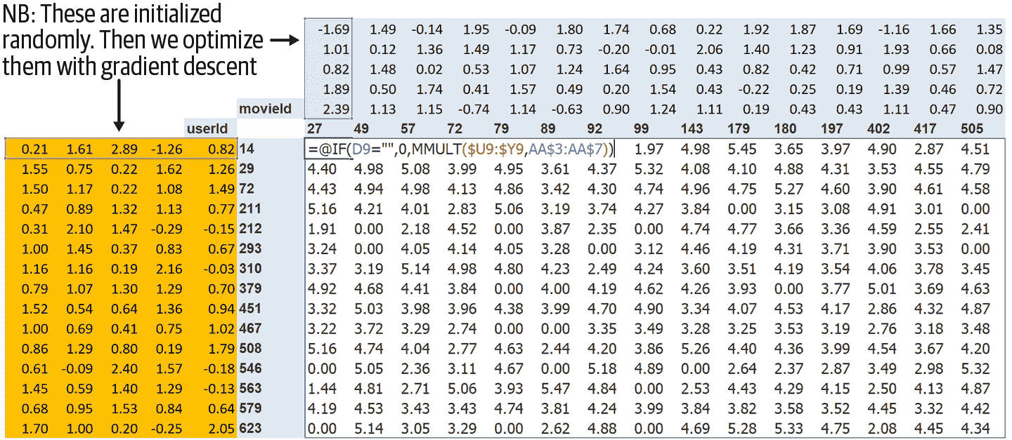 这种方法的第一步是随机初始化一些参数。这些参数将是每个用户和电影的一组潜在因子。我们将不得不决定要使用多少个。我们将很快讨论如何选择这些,但为了说明,让我们现在使用 5 个。因为每个用户将有一组这些因子,每部电影也将有一组这些因子,我们可以在交叉表中的用户和电影旁边显示这些随机初始化的值,然后我们可以填写这些组合的点积。例如,图 8-2 显示了在 Microsoft Excel 中的样子,顶部左侧的单元格公式显示为示例。
