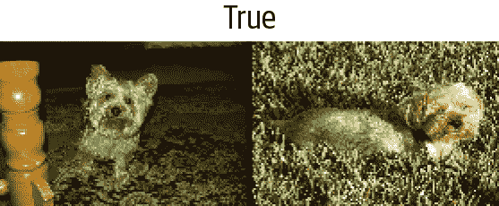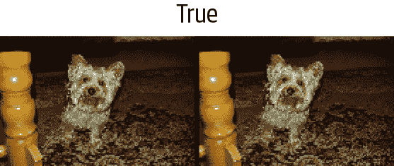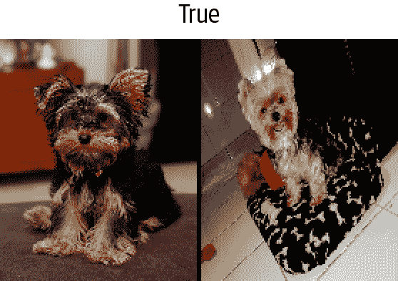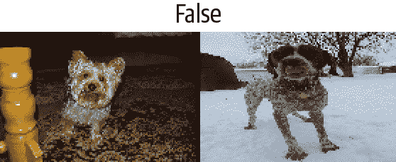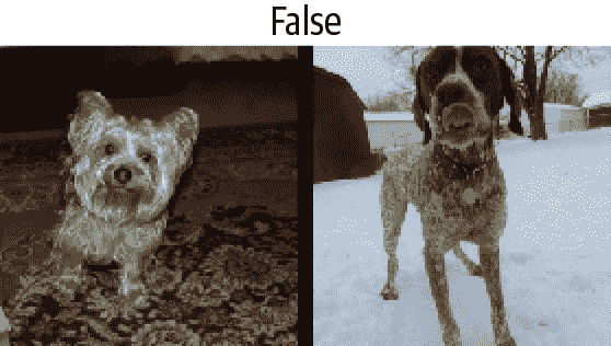 在这里,我们创建了一个SiameseImage对象,它是Tuple的子类,旨在包含三个东西:两张图片和一个布尔值,如果图片是同一品种则为True。我们还实现了特殊的show方法,使其将两张图片与中间的黑线连接起来。不要太担心if测试中的部分(这是在 Python 图片而不是张量时显示SiameseImage的部分);重要的部分在最后三行: