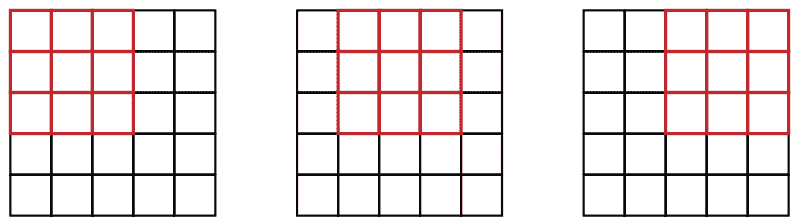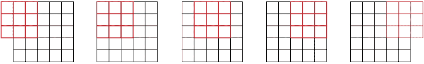 我们可以在坐标网格上映射apply_kernel()。也就是说,我们将取我们的 3×3 卷积核,并将其应用于图像的每个 3×3 部分。例如,图 13-2 显示了 3×3 卷积核可以应用于 5×5 图像第一行的位置。