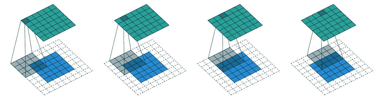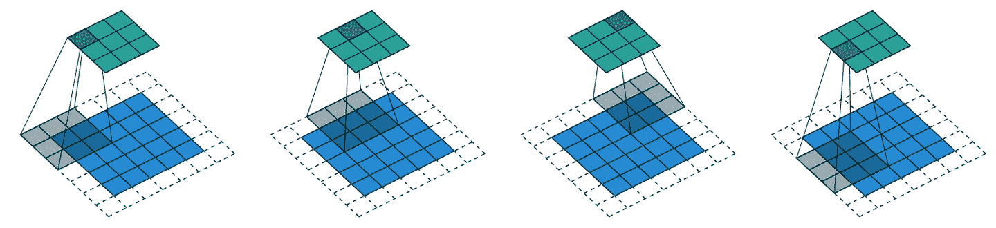 通过适当的填充,我们可以确保输出激活图与原始图像的大小相同,这在构建架构时可以使事情变得简单得多。图 13-4 显示了添加填充如何允许我们在图像角落应用核。