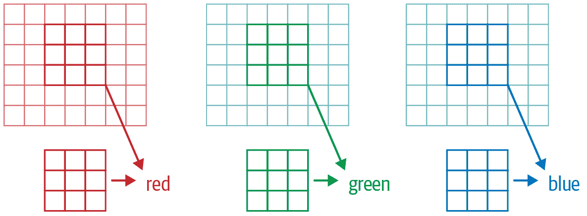 正如我们之前提到的,卷积是将这样的内核应用于网格的操作。Vincent Dumoulin 和 Francesco Visin 的论文“深度学习卷积算术指南”中有许多出色的图表,展示了如何应用图像内核。图 13-3 是论文中的一个示例,显示了(底部)一个浅蓝色的 4×4 图像,应用了一个深蓝色的 3×3 内核,创建了一个顶部的 2×2 绿色输出激活图。