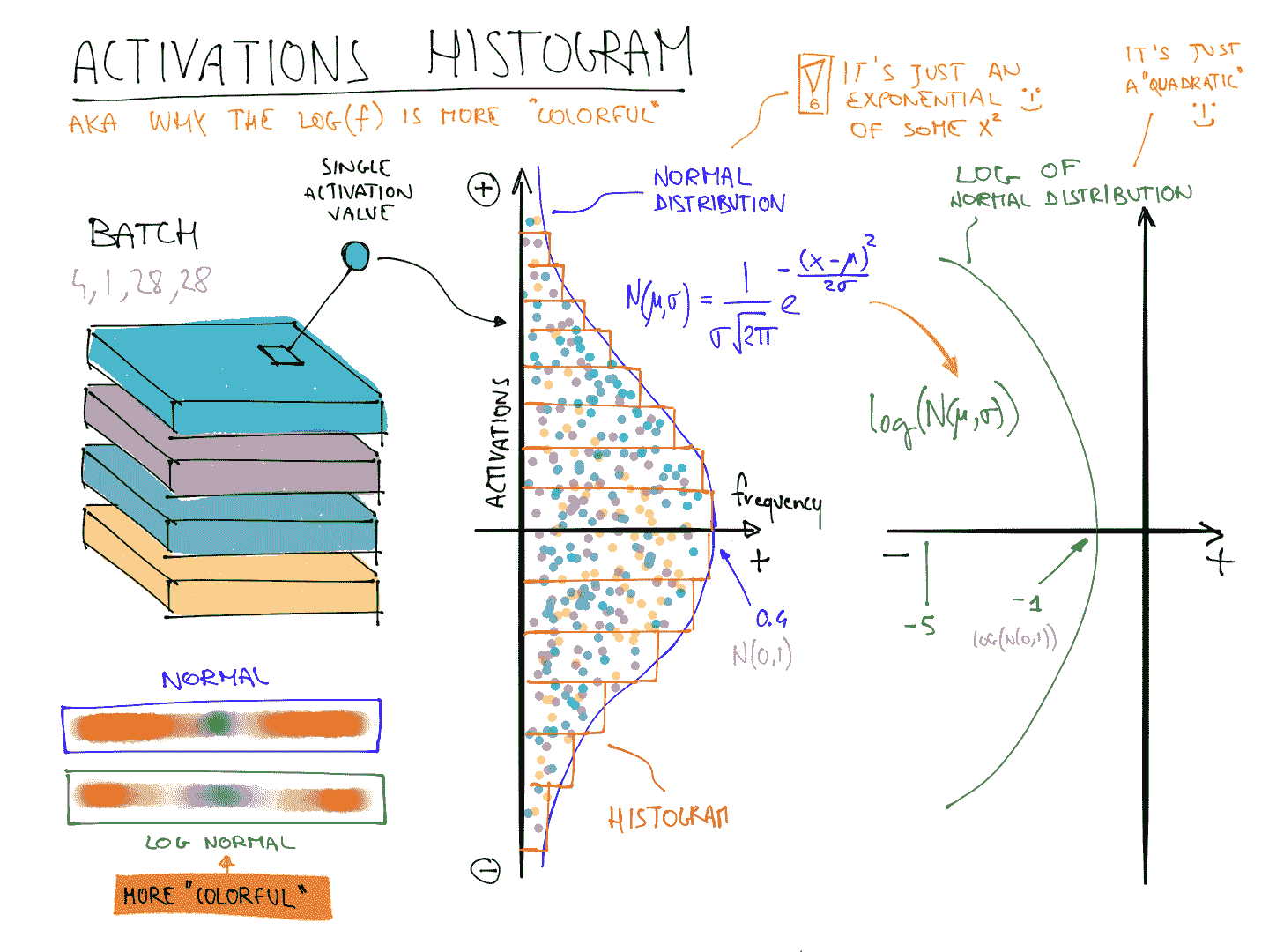 这说明了为什么当f遵循正态分布时,log(f)比f更丰富多彩,因为取对数会将高斯曲线变成二次曲线,这样不会那么狭窄。