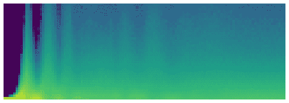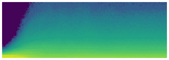 这展示了一个经典的“糟糕训练”图片。我们从几乎所有激活都为零开始——这是我们在最左边看到的,所有的深蓝色。底部的明黄色代表接近零的激活。然后,在最初的几批中,我们看到非零激活数量呈指数增长。但它走得太远并崩溃了!我们看到深蓝色回来了,底部再次变成明黄色。它几乎看起来像是训练重新从头开始。然后我们看到激活再次增加并再次崩溃。重复几次后,最终我们看到激活在整个范围内分布。