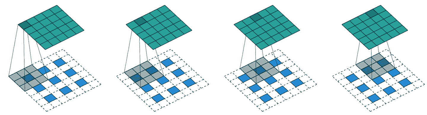 图 15-1. 一个转置卷积(由 Vincent Dumoulin 和 Francesco Visin 提供)