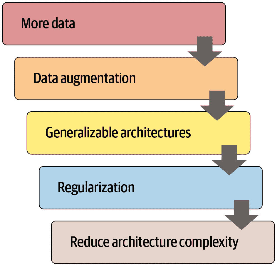 因此,第一步是达到过拟合的点。然后问题是如何减少过拟合。图 15-3 显示了我们建议从那里优先考虑的步骤。