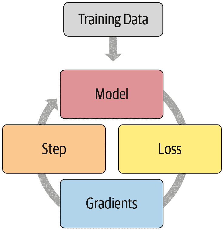 我们在第四章中解释了随机梯度下降的基础:将一个小批量数据传递给模型,用损失函数将其与目标进行比较,然后计算这个损失函数对每个权重的梯度,然后使用公式更新权重: