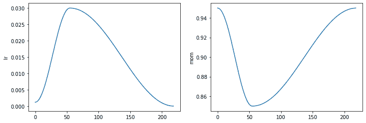 因为用动量加速 SGD 是一个很好的主意,fastai 在fit_one_cycle中默认执行这个操作,所以我们用moms=(0,0,0)关闭它。我们很快会讨论动量。